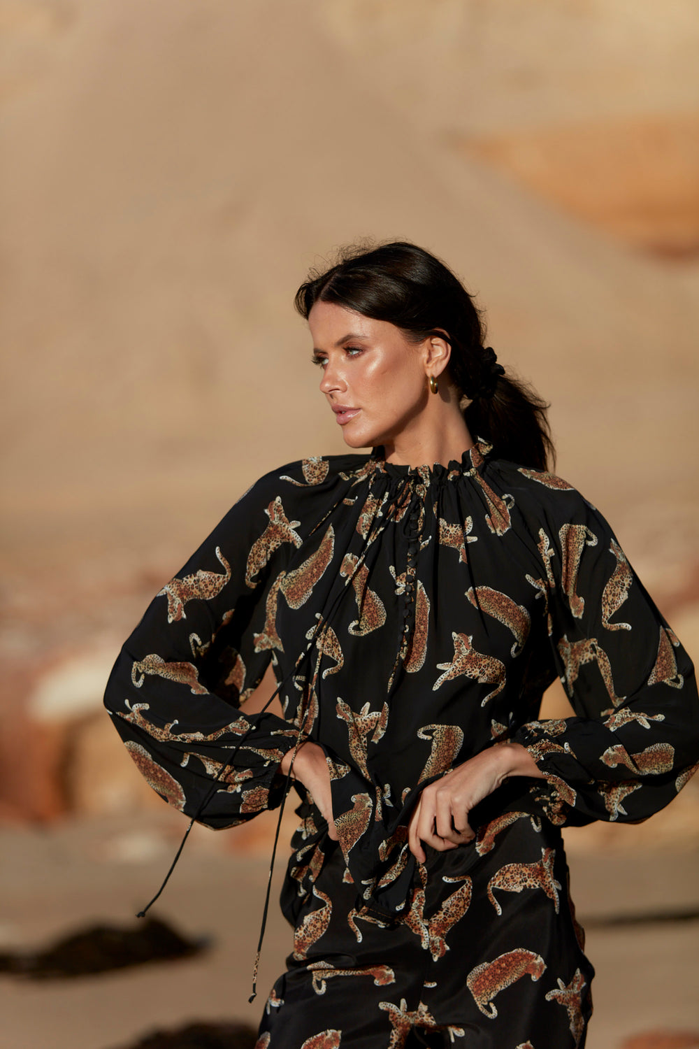 The Shelly Top is a loose fitting blouse that has a unique and feminine neckline. The Blouse is designed to be worn a number of ways using the drawstring necktie and self covered button detail. 100% Viscose - Oeko-Tex certified fabric