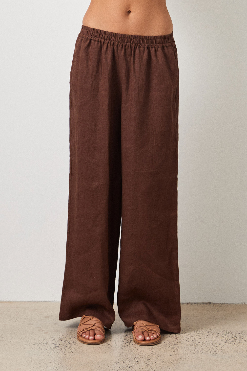The Wilson Pant features a wide leg, side pockets and an elastic waistband. This is your go to classic everyday pant for Spring. 100% Linen – Plain dyed in a rich brown “Brunette“ Finished with internal French seams