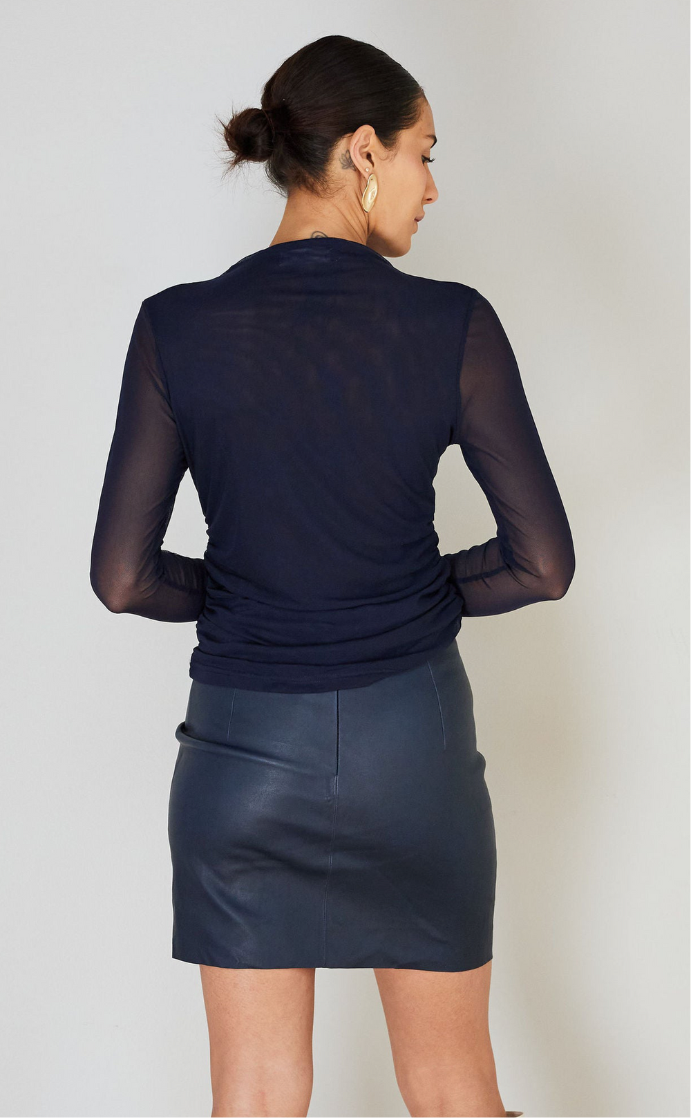 The Wye Top in the delicious Blueberry colourway is rendered in a luxurious super stretch nylon mesh. The long sleeve mesh top is lined with self fabric front and back to allow for easy, bra friendly wearing. It features a soft folded neckline and makes a fabulous outfit paired with our Dark Navy leather mini Skirt or our printed silk pants