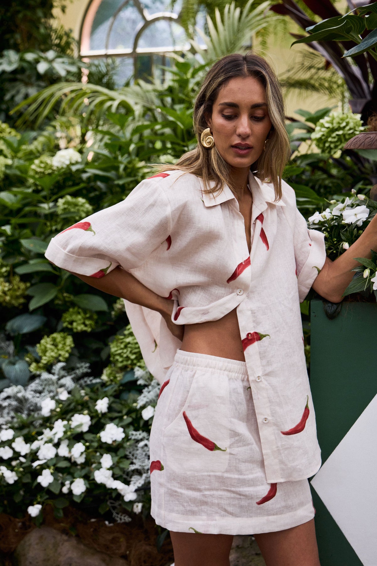 Woman wearing a white outfit with red chili pepper patterns in a garden setting